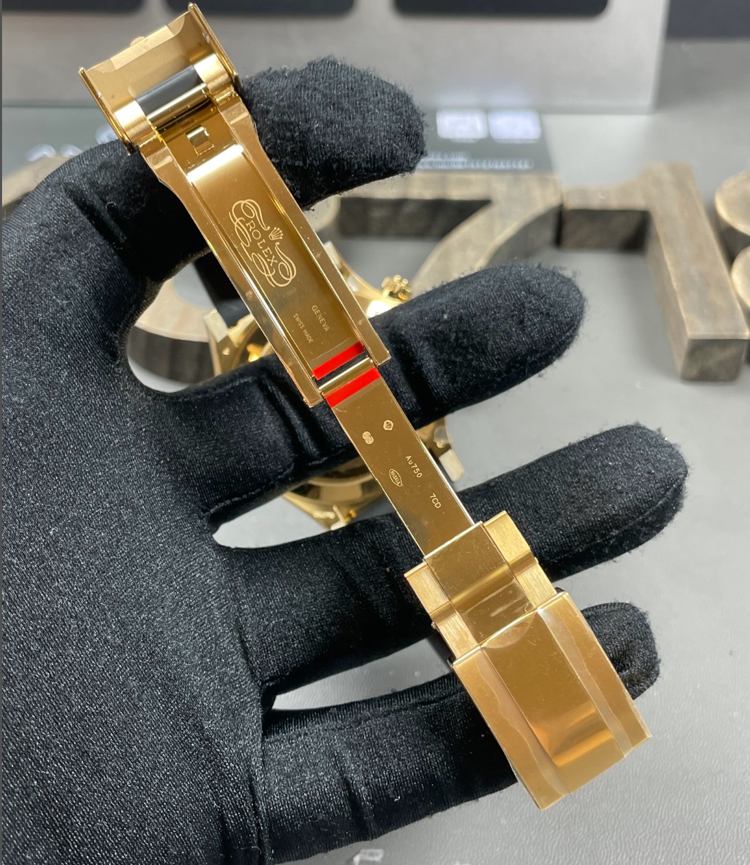 Tamaño: 40 mm x 12,6 mm Movimiento : Movimiento Super Clone4131 asiático 28800vph, 1:1 replicado del movimiento genuino, totalmente funcional. Muelle azul igual que el genuino. Reserva de marcha de 72 horas, movimiento ShangHai 4131 Funciones : Indicación de horas, minutos, subsegundos y cronógrafo Caja : Caja de acero inoxidable 904L replicada 1:1 en oro amarillo de 18 quilates, metal Cu-W para aumentar el peso del reloj para que coincida con el peso del reloj de oro genuino, el peso total del reloj es de aproximadamente 140 g Cristal : Cristal de zafiro resistente a los arañazos con recubrimiento AR Esfera : Esfera negra Bisel : Bisel taquimétrico de cerámica negra con revestimiento de acero Correa : Correa de caucho Rolex oyster flex Cierre : Cierre desplegable Resistencia : >50 metros Tenga en cuenta que esta clasificación es meramente orientativa. No aconsejamos sumergir o sumergir ninguna réplica de reloj en el agua a menos que un profesional haya hecho que su reloj sea impermeabilizado Tenga en cuenta que esta calificación es meramente orientativa. No aconsejamos sumergir o sumergir ninguna réplica de reloj en agua a menos que un profesional haya hecho que su reloj sea impermeabilizado. No garantizamos la resistencia al agua del producto y, como tal, no reembolsamos, ofrecemos crédito en la tienda, cambiamos ni hacemos una reparación gratuita en ningún reloj que tenga daños por agua.