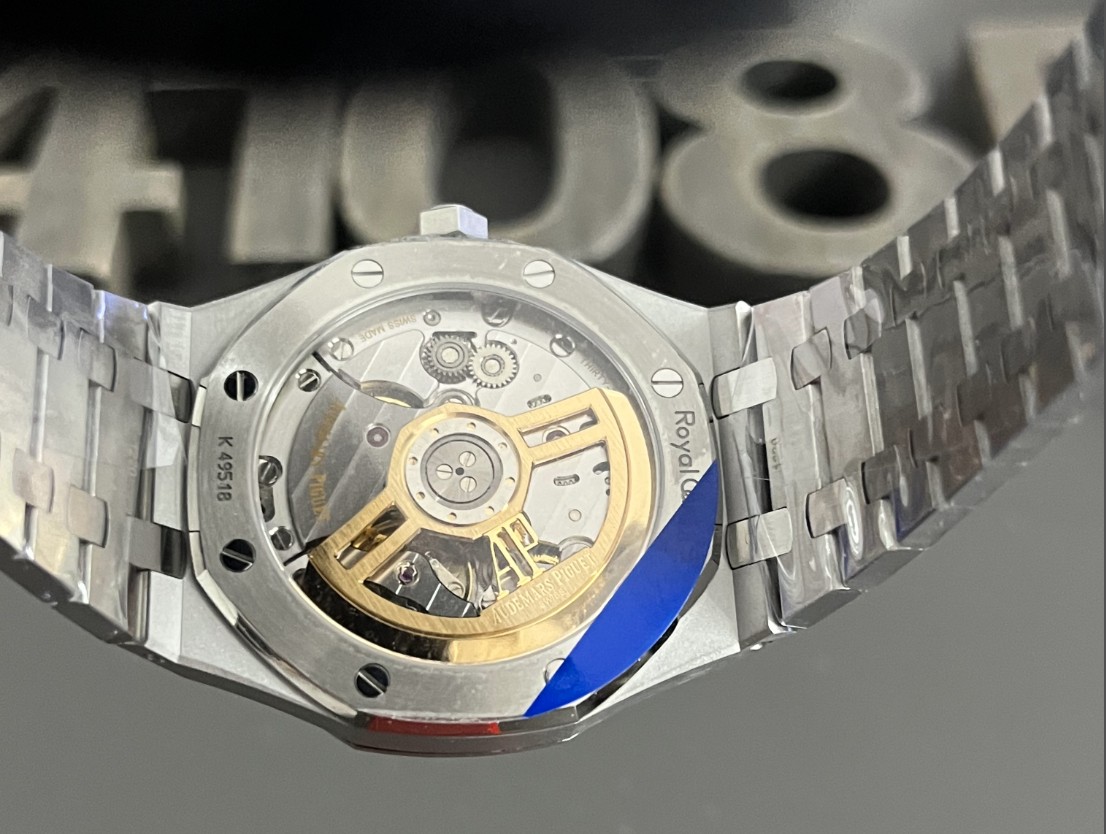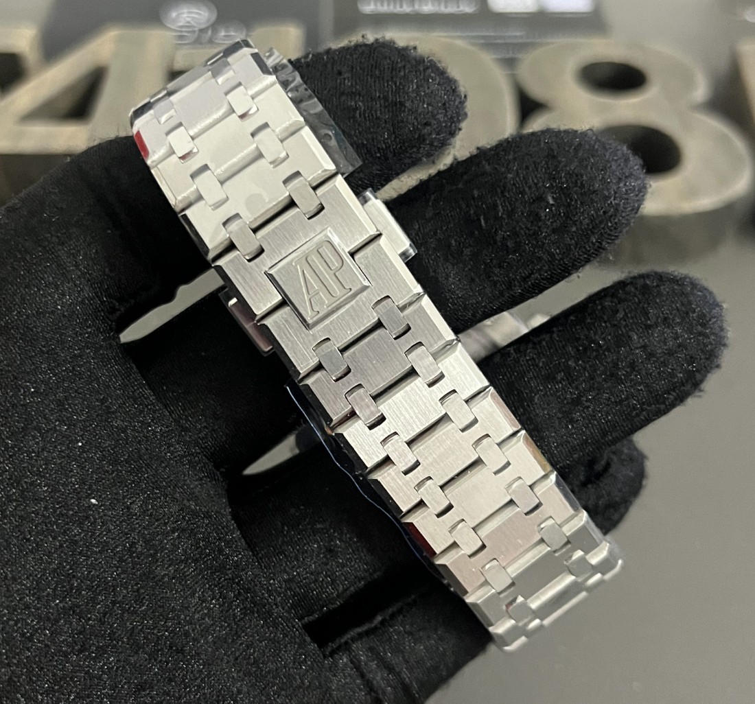 Tamaño: 41 mm x 10,5 mm (igual que el original) Movimiento : Movimiento súper clon asiático AP cal. 4302, el mejor movimiento AP asiático en este momento, cambio de fecha instantáneo Funciones : Indicación de horas, minutos, segundos y fecha Caja : Caja sólida de acero inoxidable 316L replicada 1:1, misma construcción que la genuina Cristal : Cristal de zafiro resistente a los arañazos con revestimiento antirreflectante incoloro Esfera : Esfera negra texturizada Superlumed con rehaut pulido igual que el genuino. Juego de manos suizo Bisel : Bisel de acero inoxidable cepillado/pulido (la misma textura y construcción cepillada que el original) con tornillos de bisel empotrados según lo genuino Correa : Brazalete de acero inoxidable de súper alta calidad, más liso y más suave Cierre : Hebilla desplegable doble (el mismo grabado profundo que el genuino) Resistencia : >50 metros Tenga en cuenta que esta clasificación es meramente orientativa. No aconsejamos sumergir o sumergir ninguna réplica de reloj en el agua a menos que un profesional haya hecho que su reloj sea impermeabilizado Tenga en cuenta que esta calificación es meramente orientativa. No aconsejamos sumergir o sumergir ninguna réplica de reloj en agua a menos que un profesional haya hecho que su reloj sea impermeabilizado. No garantizamos la resistencia al agua del producto y, como tal, no reembolsamos, ofrecemos crédito en la tienda, cambiamos ni hacemos una reparación gratuita en ningún reloj que tenga daños por agua.